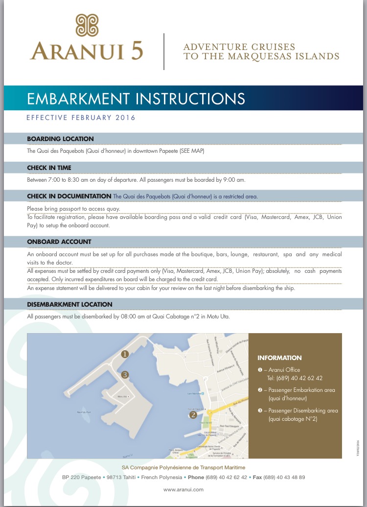 Heute sind unsere ersten Reiseunterlagen eingetrudelt! Von Papeete in Französisch Polynesien geht es für 14 Tage auf den Frachter Aranui 5. Vorne Tonnage, hinten Kabinen und keine schicken Klamotten. Das klingt nach dem richtigen Schiff für uns. Spannend!