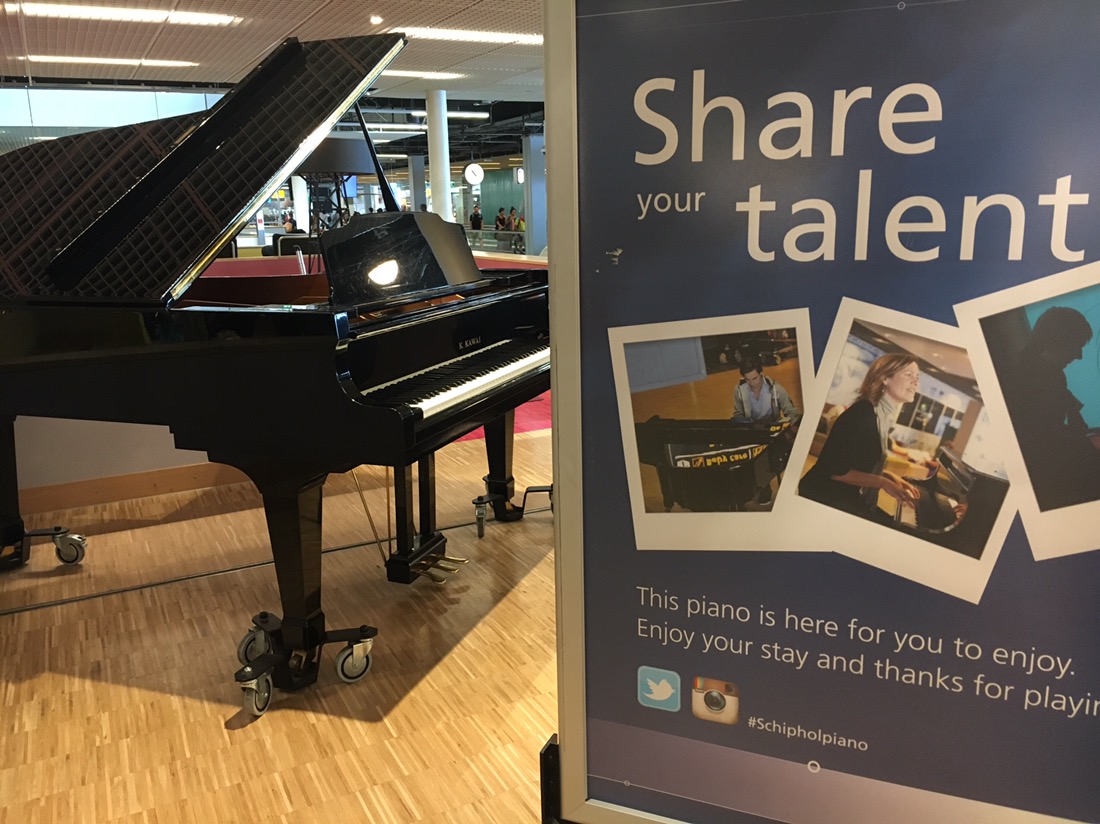 Zahllose royalblau gewandete, freundlich ihre Hilfe anbietende Hosts weisen den Weg. Es gibt genug bequeme Sitzplätze für alle. Ein durchaus leckerer Cesars Salad kostet 6,95. An den reichlich vorhandenen Steckdosen kann ich meine elektronischen Gerätschaften für den Langstreckenflug laden. Das Wifi ist gut und kostenlos. Ein ‚Flügel für alle‘ steht bereit, und ich lausche dem Konzert eines übermüdeten Reisenden, der sich und uns Zuhörern die Zeit mit wunderschönen Klängen vertreibt und reichlich Applaus erntet.
