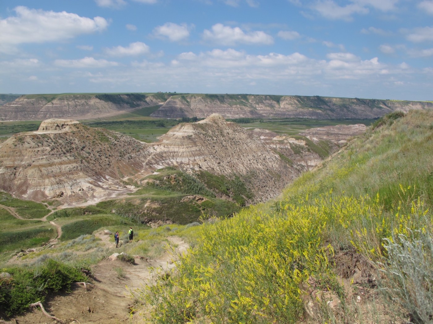 Heute sind es nicht viele Kilometer bis Drumheller, wo im Tal des Red Deer River zahlreiche Fossilien und Dino-Skelette gefunden wurden. Ein gut ausgeschilderter „Dinosaur Trail“ bringt uns gute 25 Kilometer den Fluss hinauf, auf der Strecke liegt das Royal Tyrell Museum mit zahlreichen Dino-Exponaten. Die Landschaft ist wunderschön und weit, voller Canyons und wilder Gesteinsformationen.