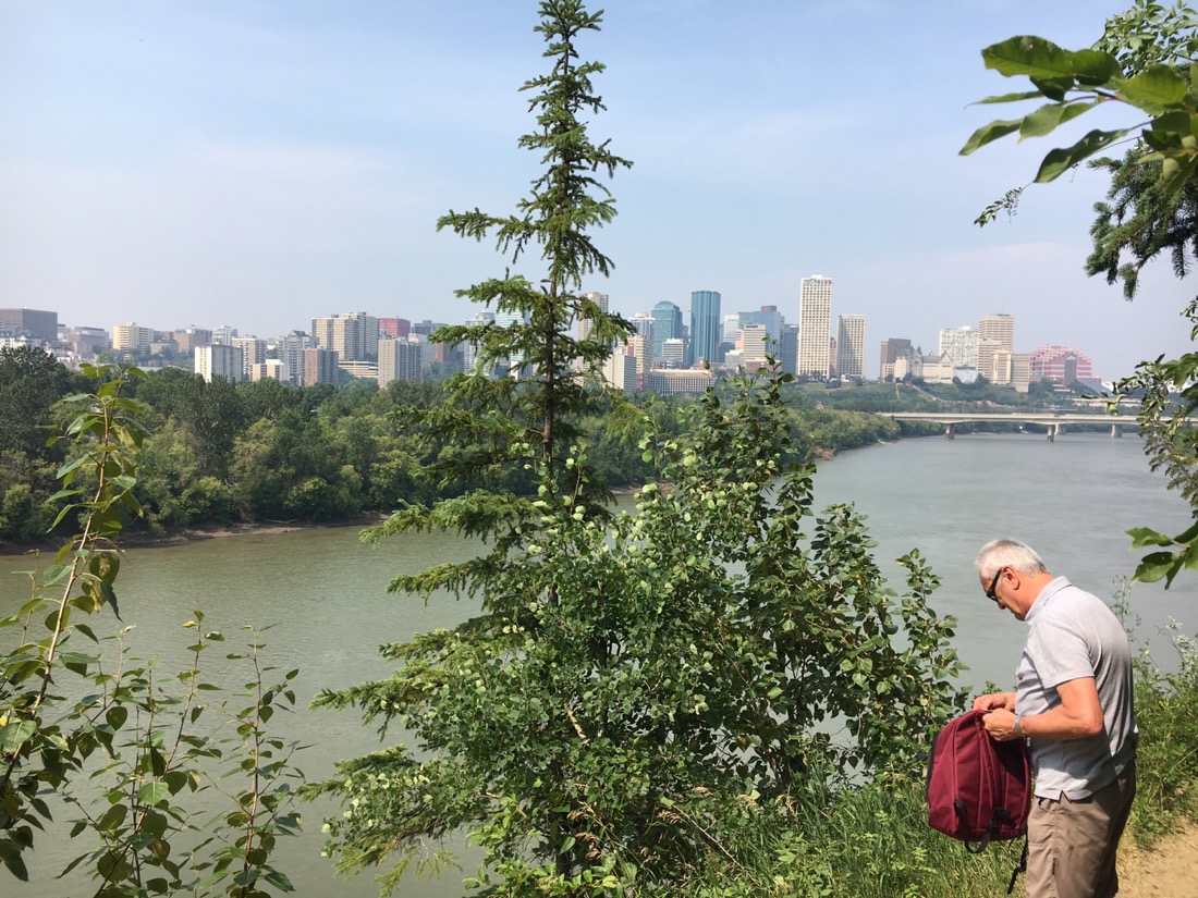 Bei einem Spaziergang im Park über dem North Saskatchewan River lasse ich mich später von den allgegenwärtigen (tschuldigung) Kackbratzen stechen, obwohl ich mich genauso eingesprüht habe wie Abi, aber wir schießen immerhin ein schönes Foto von der Skyline. Mit den Mücken muss ich mich wohl noch eine Weile abfinden. Man kann nicht alles haben.