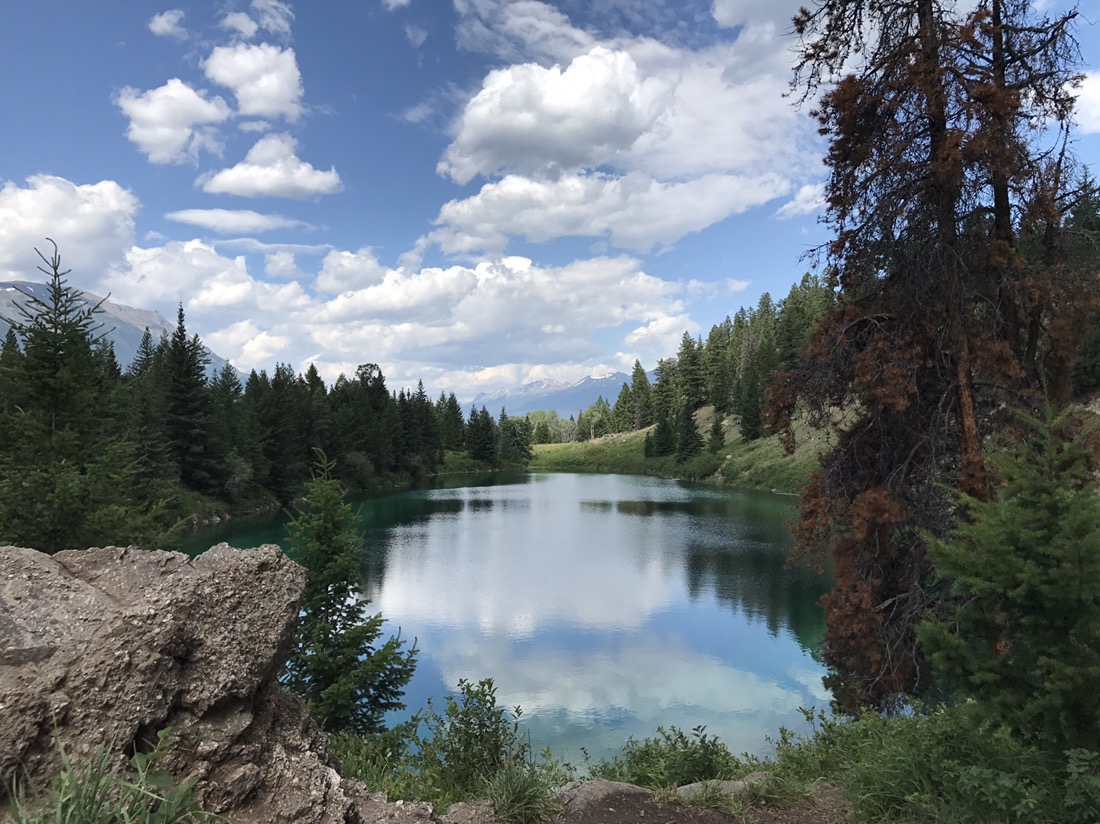 Aber: Diese Aussicht hier oben ist ein Traum. Die vielen Wolken am Himmel schaffen eine dramatische Atmosphäre und der Wind bläst ordentlich dazu. Am Gipfel befinden wir uns jetzt auf 8080 Fuß, das sind 2470 Meter. Ganz weit weg (genauer gesagt 75 km weit weg) meinen wir die Umrisse des höchsten Bergs der Rockies, des Mount Robson, ausmachen zu können. Die Richtung stimmt jedenfalls. Ich entdecke ein Hörnchen und Abi ein Murmeltier, die sich alle beide von uns Wanderern wenig beeindruckt zeigen und willig in die Kamera schauen, bevor wir bei einer Tasse Kaffee die Karte konsultieren und weitere Pläne für den Tag schmieden. Die Wanderung durch das „Valley of the five Lakes“ soll es sein. Nicht zu viele Höhenmeter, nicht zu lang.