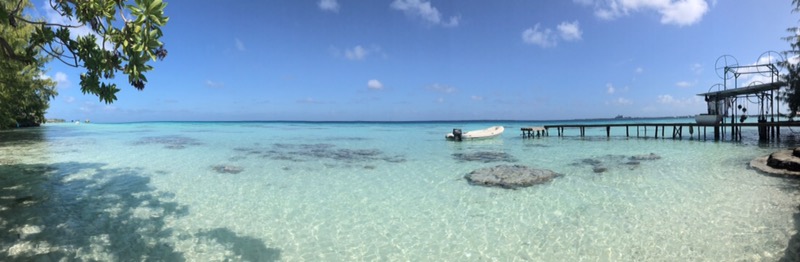 Fakarava ist das berühmteste Tauchrevier frz. Polynesiens. Später berichten mir Gäste, dass sie beim Tauchgang Haie und Moränen um sich hatten, und ich frage mich, was daran wohl erstrebenswert ist?! Mit meinem Schnorchel treffe ich im seichten Wasser altbekannte Freunde aus Moorea wieder an und Abi uns ich liegen unter Palme 7, als zwei Hunde zu Besuch vorbeikommen. Der Weiße hat seinen Spaß, indem er Schuhe unserer Reisekameraden wegschleppt und tappt mitten über mein Handtuch, das ich so sorgfältig von Sand freihalten wollte. Das sind aber auch schon unsere einzigen Sorgen an diesem paradiesischen Ort. Eine Strandbar ein paar hundert Meter weiter die Straße hinauf serviert kalte Getränke und bietet leidlich gutes Internet an. Texte gehen durch, Bilder gar nicht. Von einem der Aranui-Tourguides erfahre ich, dass auch das Schiffs-Internet keine Bilder transferieren können würde. Auch nicht in noch so geringer Auflösung.