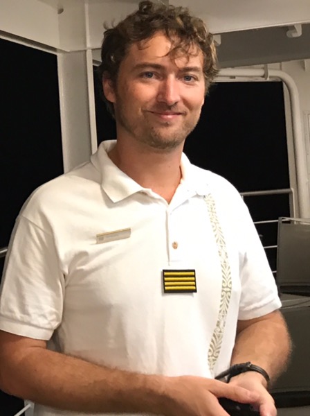 Abends um 18 Uhr wird uns heute die komplette Mannschaft namentlich und mit Rang vorgestellt, jeder einzelne unter großem Applaus. Es sind ja nicht so viele. Eine wirklich sympathische Veranstaltung! Und ihr werdet es nicht glauben, dieser junge Smartie hier (in der Hoffnung auf besseres Netz auf Nuka Hiva morgen) ist unser Kapitän: