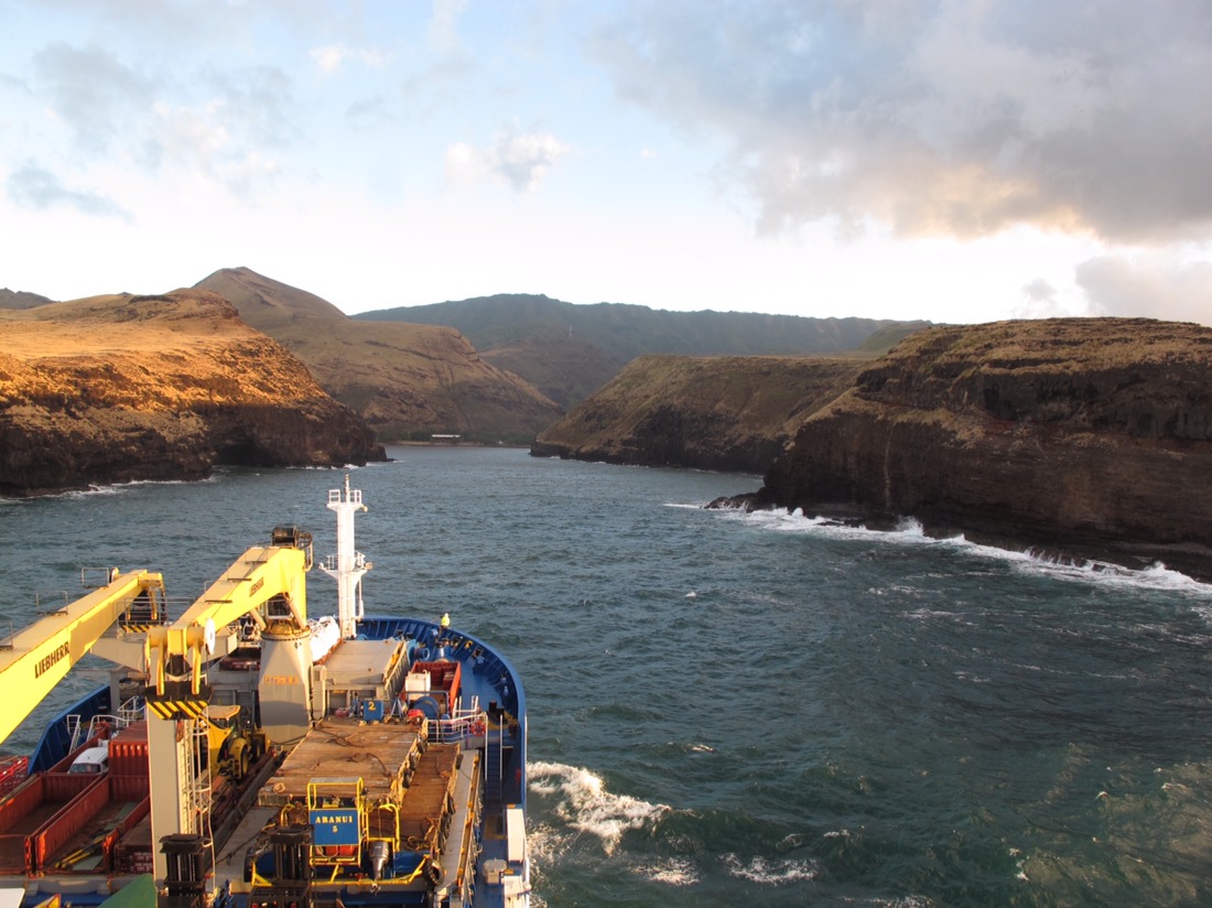 Wie schwierig das wirklich war, davon kriege ich eine Vorstellung als wir um 7:45 Uhr die Barge an Land betreten. Im Wellental liegt sie gut und gerne einen Meter unter dem Ausstieg, dann auf Einstiegshöhe einen Meter drüber. Jeweils zwei Seemänner an Bord des Schiffs nehmen uns Passagiere einzeln rechts und links unter die Arme und werfen uns im rechten Moment förmlich in die Arme zweier Seeleute auf der Barge, die uns sicher auffangen. Ganz schön abenteuerlich!