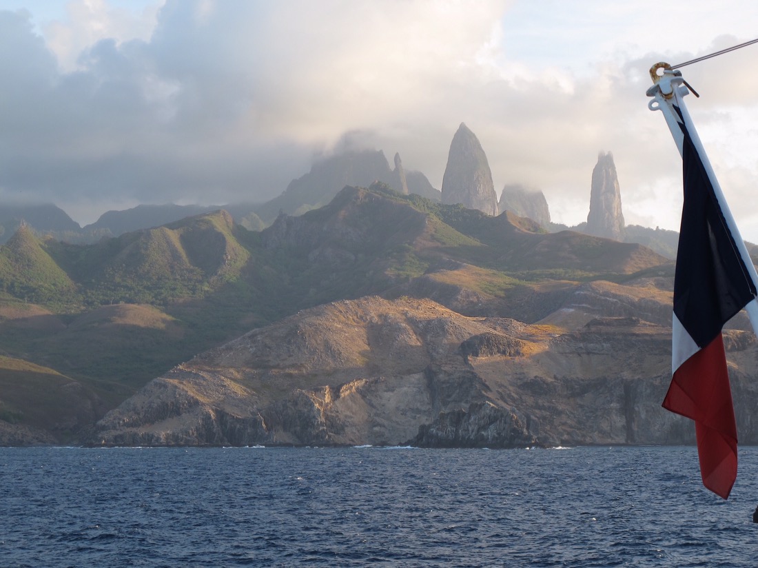 Wir verlassen zum zweiten Mal auf dieser Reise die Bucht von Ua Pou und diese Passage steht der ersten in nichts nach. Die Landschaft sieht märchenhaft aus und erinnert mich an das alte Brettspiel ‚Sagaland‘, das ich in meiner Kindheit mit meinen Freunden Kathi, Christian und Silke so oft gespielt habe. Die untergehende Sonne meint es heute zudem besonders gut und malt die wattebauschartigen Wolken rosa-pink an, während wir geschmeidig an der Küste entlanggleiten. Ich habe sicher 30 Bilder desselben Motivs im Kasten, als Theres, liebe Reisegesellschaft aus der Schweiz, und ich auf die andere Seite des Schiffes gerufen werden. Was für ein Sonnenuntergang! Das Licht bricht sich hunderttausendmal in der dunstigen Luft und zeichnet alle denkbaren Mischungen und Nuancen von rot, gelb und blau ans Firmament und die See glitzert silbern dazu. Ich fürchte, ich wiederhole mich, aber es ist so unglaublich schön hier!