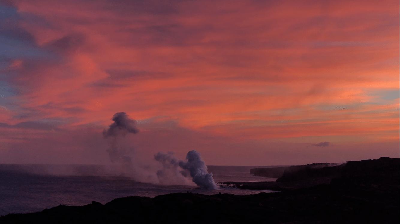 Wir kommen am Endpunkt an und kraxlen über eine alte Lavawüste bis zum Zaun. Sie lassen einen nicht besonders nah herankommen, denn die Dämpfe sind anscheinend mitunter giftig. Aber was haben wir hier für einen farbenprächtigen Sonnenuntergang!