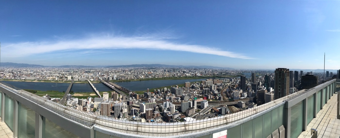 Wir verlassen den Flughafen, der aus Platzmangel auf einer künstlichen Insel errichtet ist, und auf dem Weg nach Osaka ist es immer dasselbe Bild: rechts wie links reihen sich Häuser, Wirtschaftsgebäude und Industrie einerseits bis zum Meer und andererseits bis zu den Bergen am Horizont. Ich sehe keinen Grashalm, kaum Bäume, sondern im wesentlichen nur Beton, Brücken, Straßen und Fracht-Schiffe.Im Zentrum Osakas steht ein recht berühmtes Gebäude, angeblich Japans einziges von Weltruhm, das Umeda Sky Building. Wir fahren hinauf und von oben sieht man das Häusermeer am besten. Es sieht erst einmal aus wie jede Großstadt, der Unterschied ist aber, dass es kein Ende nimmt. Sakai geht in Osaka fließend über und Osaka in Kyoto.