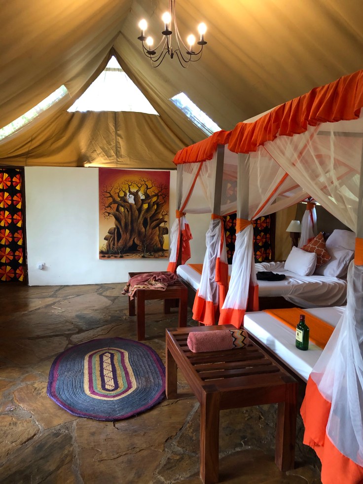 Wir erreichen die Lodge um 15 Uhr und sollen in 30 Minuten drei Dinge tun: Mittagessen, Zimmer beziehen, duschen und umziehen. Denn um halb vier soll unser Boot ablegen. You may assume: das geht nicht. Jetzt muss man wissen, dass tansanische Lodgemanager samt und sonders Plappermäuler sind. Ich bitte ihn, sich kurz zu fassen. Als er bei der Geschichte der Anlage ansetzt, falle ich ihm ins Wort, bitte um die Schlüssel und sage die Zeiten eben in Eigenregie an. Das Boot fährt später, Essen in 30 Minuten, WLAN gibt’s nicht (was die Sache erheeeblich beschleunigt) und tschüss. (Erstens, zweitens, drittens … 🙈) ein bisschen unfreundlich von mir, aber ich mache es wieder gut und mehr ist einfach gerade nicht drin.