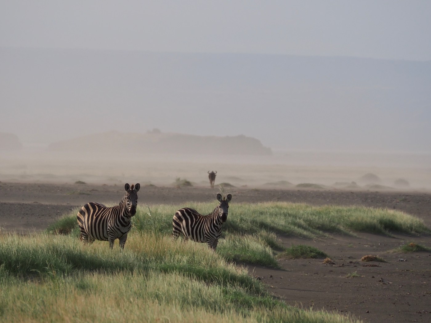 Die Paviane Voraus sind Copy nicht geheuer, Gnus und Zebras machen ihm später wenig aus. Weiser Copy, denn mit Pavianen ist wirklich nicht zu spaßen! Lerai führt uns auf eine Anhöhe mit einer irren Aussicht über den See und die beinahe unwirklich schöne Landschaft. Die Fernsicht ist heute gigantisch. Im Hintergrund erhebt sich majestätisch der Ol Donyo Lengai und seine steilen Lavawände glitzern in der Morgensonne. Pelikane liefern uns eine Flugschau. Reiher auf der Suche nach einem Frühstück staksen durchs seichte Wasser. Saftiggrünes Schilfgras bildet einen schön anzusehenden Kontrast zum goldbraunen Sand der Umgebung und dem knallblauen Himmel. Ein mächtiger Wind zerzaust uns das Haar und die frische, kühle Luft pustet durch die Shirts. Wir erklimmen einen zweiten Hügel, schießen ein paar Schnappschüsse auf einem Felsvorsprung und halten schließlich auf die Ebene zu, wo die „Footprints“ zu sehen sind. Unten steht viel frisches Gras, weil es dieses Jahr so viel geregnet hat und der Ngare Zero Fluss aus dem Ngorongoromassiv hier in diversen Bächlein in den salzigen See mündet. Das scheint sich herumgesprochen zu haben, denn die Ebenen sind voller Gnus und Zebras. Wir marschieren mehr oder weniger direkt durch die Herden und da bleibt dann auch einem alten Safari-Hasen wie mir die Spucke weg. Zebras am Wasser im hohen Gras vor dem Heiligen Berg der Massai. Was für ein Anblick, was für ein Fotomotiv! Ich kann unser Glück kaum fassen.
