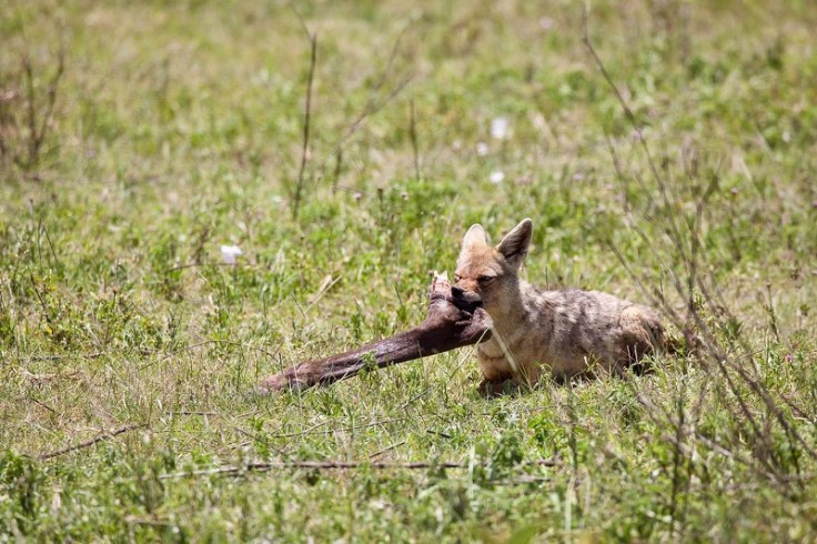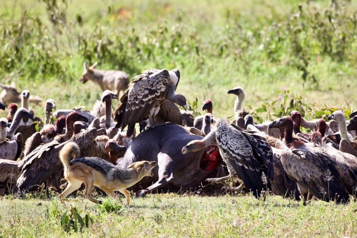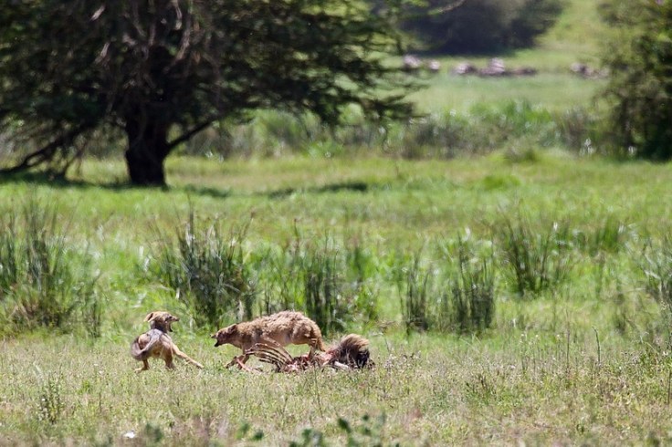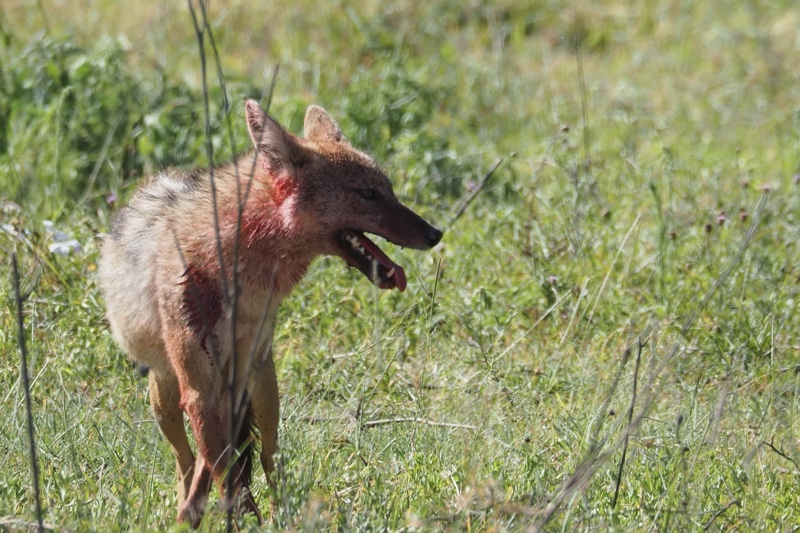 Wenn mir diese pietätlose Bemerkung gestattet ist, so war es beinahe aufmerksam von jenem Gnu, direkt neben der Straße das Zeitliche zu segnen. Denn Szenen dieser Art bekommt man nicht oft zu sehen, erst recht nicht aus so geringer Entfernung. Es ist faszinierend, in welch rasender Geschwindigkeit die Dinge ihren Lauf nehmen, während Mutter Natur Regie führt. Zuerst treffen die Geier ein, nach ihnen die Marabus. Die nächsten am Set sind Schabrackenschakale und natürlich Hyänen. All diese Aasfresser belagern das tote Tier und das große Fressen geht nicht ohne den ein oder anderen handfesten Streit vonstatten, wobei die Schakale wie immer zuerst das Nachsehen haben. Reichlich angesäuert und mit blutroter Schnauze nimmt einer die Beine in die Hand und hält auf uns zu. Die siegreiche Hyäne schaut ihm nach und nimmt sich als nächstes der lästigen Vögel an. „Alle weg da!“ scheint sie zu rufen, aber die Geier interessieren sich nicht weiter für’s Fußvolk und lassen sich nicht vertreiben.