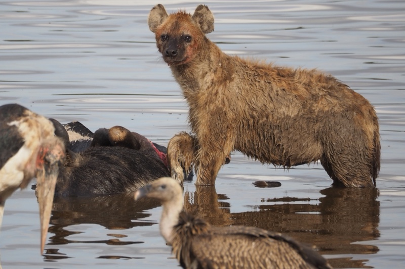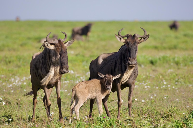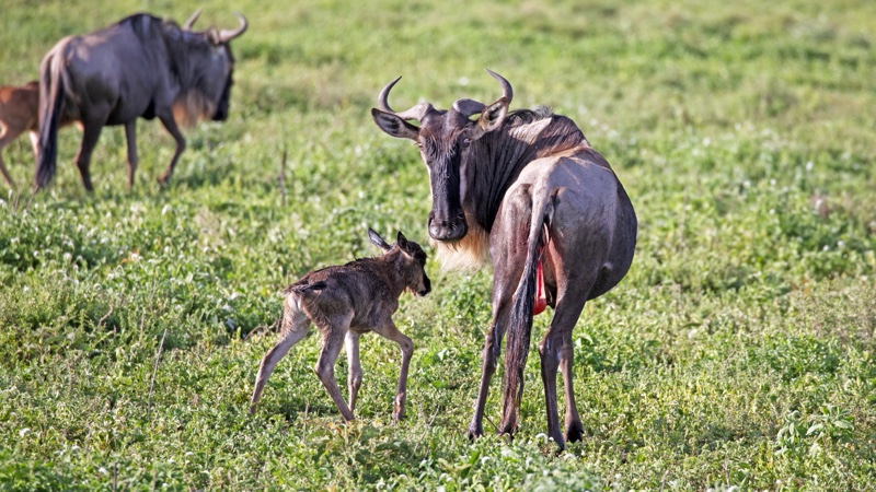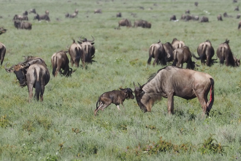 Mit respektvollem Abstand in Tele-Entfernung verfolgen wir seit bestimmt schon 20 Minuten eine Gnudame, die sich mit der Geburt schwerer tut. Kleine Beinchen schauen schon heraus, aber der Rest will einfach nicht folgen. Sie legt sich hin und steht wieder auf, wandert weiter – nicht, ohne dabei ab und zu an Grashalmen zu zupfen – und legt sich wieder hin. Als wir schon befürchten, dass das Kleine unmöglich noch leben kann, kommt Bewegung in die Sache und siehe da – da flutscht es endlich heraus. Zur Geburt dreht sie sich schnell und lange um ihre eigene Achse, nutzt den Schwung als Unterstützung für’s finale Pressen und begrüßt den Sprössling zunächst stürmisch, dann ganz sachte mit einem Küsschen. Stille im Safari-Fahrzeug. Es ist ein berührender, ganz besonderer und auf eine sonderbare Weise sehr persönlicher Moment. Weitere, bisher völlig unbeteiligt scheinende Tiere kommen zum Gruß vorbei, als wollten sie ihre Ehre erweisen. Dann ermuntert Frau Mama das Kleine, noch bevor sie es trinken lässt, zu ersten wackligen Schritten und erhöht später das Tempo. Erst, als sie zufrieden ist, darf Junior an die Milchbar und beide gehen ihrer Wege.