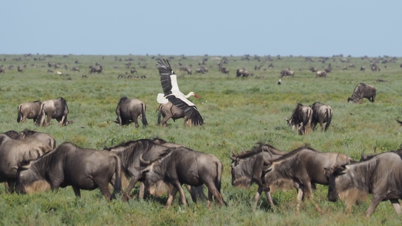 Es ist wieder einmal früher Morgen in Afrika und wir juckeln schon seit einer guten Stunde über die Makao-Plains, eine Grasebene der Region Ndutu im Ngorongoro-Schutzgebiet. Hier haben Wilson und Karim die Herden der großen Tierwanderung aufgetrieben und es sind heute Morgen Hunderttausende Tiere, die wir kreuzen, wenn nicht mehr. Egal, wie weit wir fahren, bis zum Horizont und weiter, immer weiter sieht man nichts als schwarze Punkte. Alles Gnus. Vereinzelt mischen sich Zebras und Thomson-Gazellen unters Volk. Weitere Protagonisten des Tages sind Hyänen, Geier und viele Störche. „Ist doch klar, dass die Klapperstörche hier sind, wo alle paar Minuten ein neues Lebewesen das Licht der Welt erblickt“, gibt Philipp zum Besten. Und so ist es. Die meisten Kälbchen fallen in Sekundenschnelle aus der Mama, die dafür kaum das Grasen ruhen lässt. Zum Glück muss ich mir nicht mit ansehen wie ein Raubtier zuschlägt und einen frischen Happen vertilgt! Und auch die Männer um mich herum sind insgeheim froh, dass uns solche Szenen heute erspart bleiben. Natürlich ist es der große Traum vieler Hobby-Fotografen und -Filmemacher, einmal im Leben eine erfolgreiche Jagdszene in freier Wildbahn zwischen Großkatze und Beutetier einfangen zu dürfen. Aber bitte nicht heute, bitte nicht hier in diesem riesigen Kinderzimmer voller staksiger Gnukälber. Und bitte nicht vor meiner Nase.