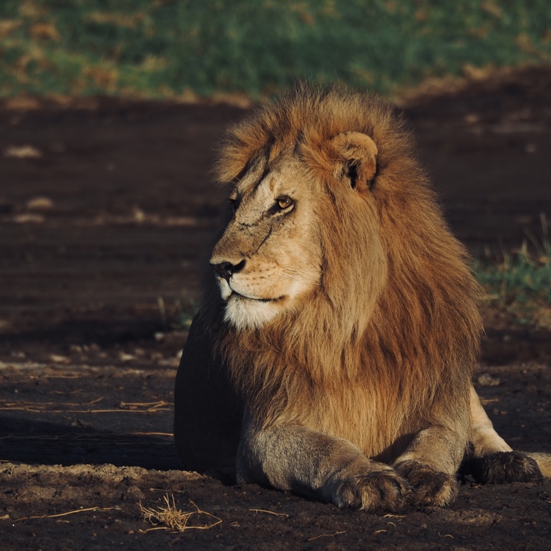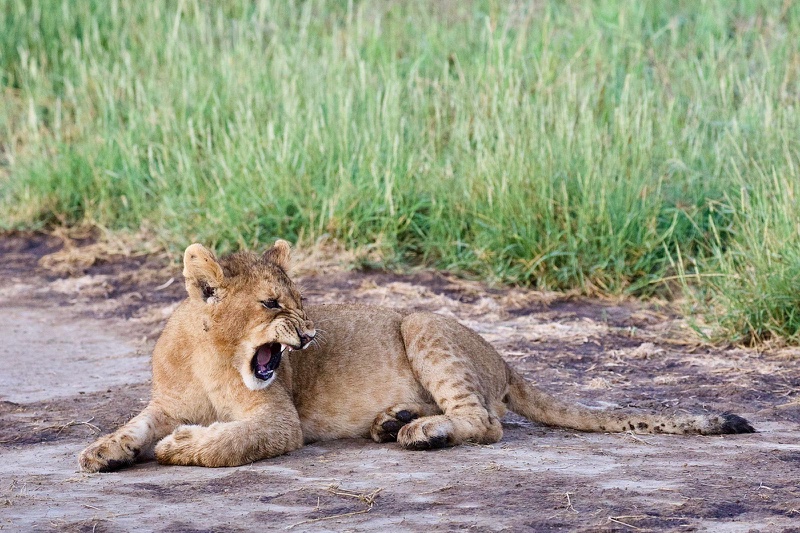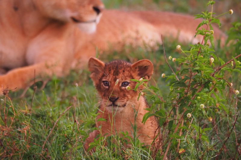 Jene Beute hat in der Nacht eine Löwenfamilie gemacht. Das tote Gnu dampft noch, als wir die Szene mit unseren Jeeps erreichen und etliche Löwen zieren verräterisch blutrote Mäuler. Der erste Hunger ist also schon gestillt, wir platzen quasi mitten ins Kaffeekränzchen nach dem großen Fressen. Zwei Halbstarke toben durchs Gras und spielen Fangen. Drei ausgewachsene Weibchen chillen in der Morgensonne. Ein winziges, wenige Wochen altes Löwenbaby wird von seiner Mutter zurechtgewiesen und im Gebüsch versteckt, zeigt sich aber so gar nicht einsichtig, kommt zu unserer Freude nochmal angetapst und beäugt neugierig aber skeptisch unsere Fahrzeuge. Natürlich teilt Karim eine solch besondere Sichtung mit anderen Guides über Funk. Als in Windeseile zu viele Land Cruiser anrollen wird es der Rudel-Chefin zu bunt, und sie zerrt in einem bemerkenswerten Kraftakt das halb aufgefressene Gnu tief in die Büsche hinein. Schluss mit Voyeurismus, die Show ist beendet! Doch, Moment, noch nicht ganz: Bevor sie sich zum Dösen niederlässt, beseitigt sie die Geruchsspuren dort, wo eben noch der Kadaver lag, indem sie Gras und Erde mit den Tatzen verwischt. Sicher hat sie wenig Lust, die Beute mit Hyänen und weiteren ungebetenen Gästen zu teilen. Zwei Halbstarke und nur ein einziges ganz Kleines – das heißt eben auch, dass dieses Rudel jüngst ganz offensichtlich viele Verluste zu beklagen hatte…