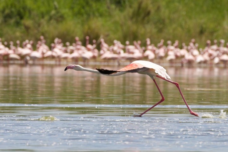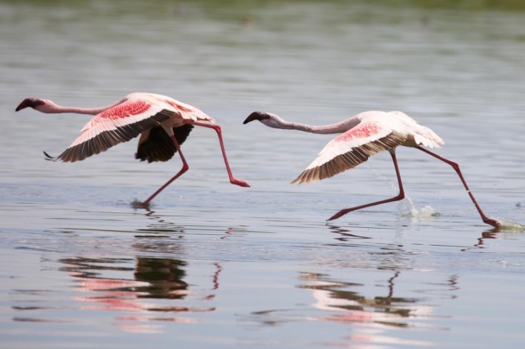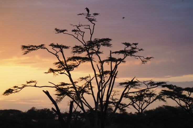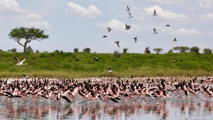 Und so, wie in jenem so behutsam gefilmten Werk, genau so sieht die Serengeti im Januar und Februar aus. Es ist nicht das große Stelldichein der Tiere zu erwarten, jetzt, wo sich alle Zebras und Gnus in Ndutu konzentrieren. Im hoch stehenden Gras sind kleinere Antilopen und Katzen aller Art schwer auszumachen. Aber diese Landschaft! SIRINGIT, weites Land! Oh, wie wahr! Sattgrüne Ebenen so weit das Auge reicht! Mal ziehen einsame Elefantenbullen vorbei, mal selbst im höchsten Gras nicht zu übersehende Giraffen. Und jetzt ist die ideale Zeit für die Vogelbeobachtung! Lovebirds schnattern herum und die allgegenwärtigen Gabelracken, darüberhinaus sichten wir etliche Raubvögel wie Falken, Bussarde, Habichte und Adler. Sie alle finden nun reichlich Nahrung auf dem feuchten Boden, der Gräser und Pflanzen sprießen läßt, die ihrerseits wiederum allerlei kleine Nager ernähren. Und irgendwo mussten sich ja all die Flamingos herumtreiben, die wir in Manyara vermutet, aber nicht angetroffen haben. Wir entdecken eine große Gruppe mit etlichen Tausend Tieren in der Nähe der Moru Kopjes an einem saisonalen See. Wie für uns zum Gefallen kommt Bewegung in die Truppe. Sie starten, wie es sich für einen Schwarm gehört, wie auf Knopfdruck gemeinsam in die Luft und drehen eine großzügige Runde, nur um am anderen Ende des Sees wieder zu landen und mit der Nahrungsaufnahme fortzufahren, als sei gar nichts gewesen. Dankeschön, liebe Flamingos, das war wunderschön!