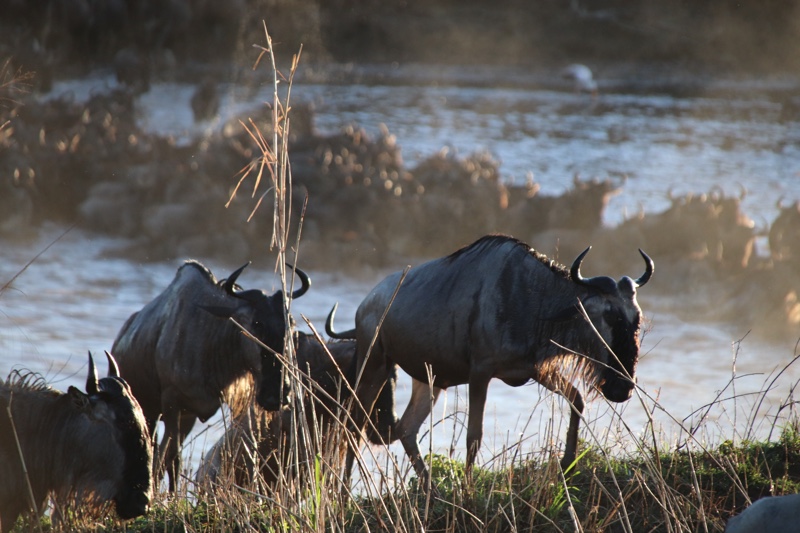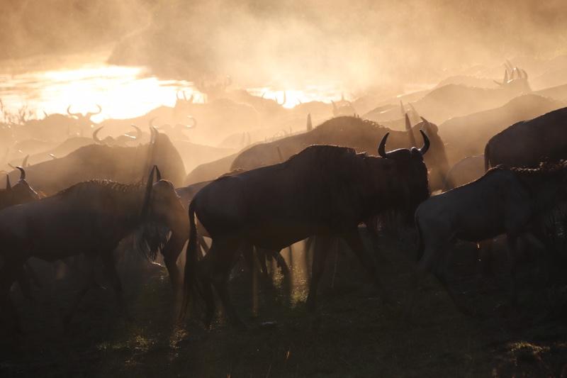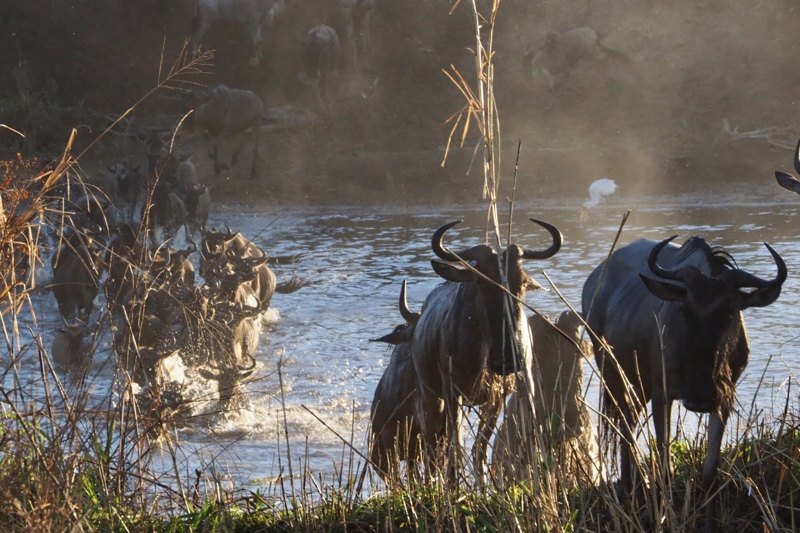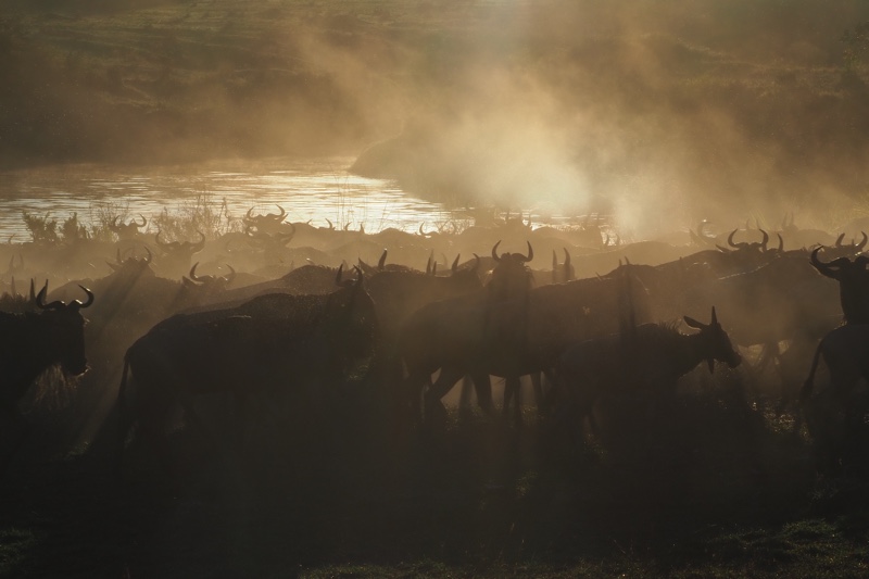 „Haraka Haraka!“ ruft Amini, legt den Gang ein und brettert los. Es ist früher Morgen, die Sonne bricht sich so eben Bahn und eine gewaltige Staubwolke weist uns den Weg hinunter zum Fluss. Im diffusen Licht des silbrigen Vollmonds und der aufgehenden Sonne stehen wir mit unseren drei Fahrzeugen allein am Ufer und werden Zeuge dieses aus dem Fernsehen bekannten Schauspiels, als sich nicht weniger als 100.000 Tiere in die Fluten stürzen. 20 Minuten dauert dieses Crossing und zu meiner größten Freude muss ich nicht mit ansehen, wie ein Krokodil zuschnappt. Ich meine, wenn man drei Tage im August hier ist und gar kein Crossing sieht, dann hat man schon echt Pech, aber man sieht es ganz gewiss nicht immer so.