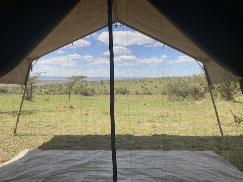 Wenn ich den Kopf hier von meinem Bett aus im Zelt Nummer 1 nach links wende, dann sehe ich einen weiten sattgrünen Hügel, der in typischer Serengeti-Art mit Akazien durchsetzt ist. Am strahlend bleuen Himmel sorgen Wattebausch-Wolken für schönstes Licht.