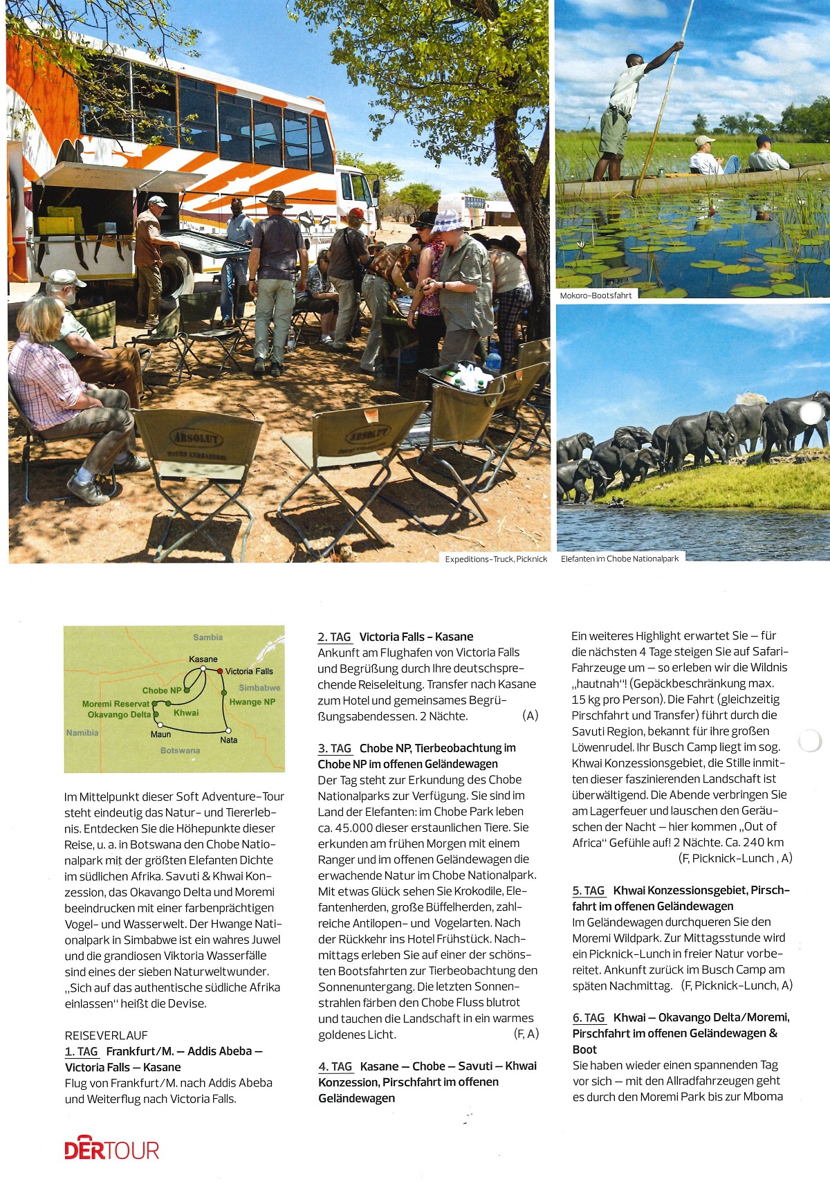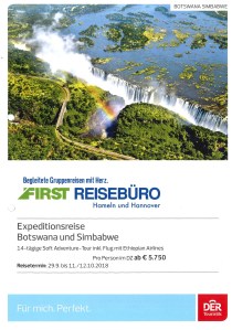 Weiter geht’s für ein paar Tage in Geländewagen durch tiefsten Busch bis ins Okavangodelta und im weiteren Verlauf durch den Hangwe-Nationalpark in Simbabwe bis zu den Viktoriafällen.