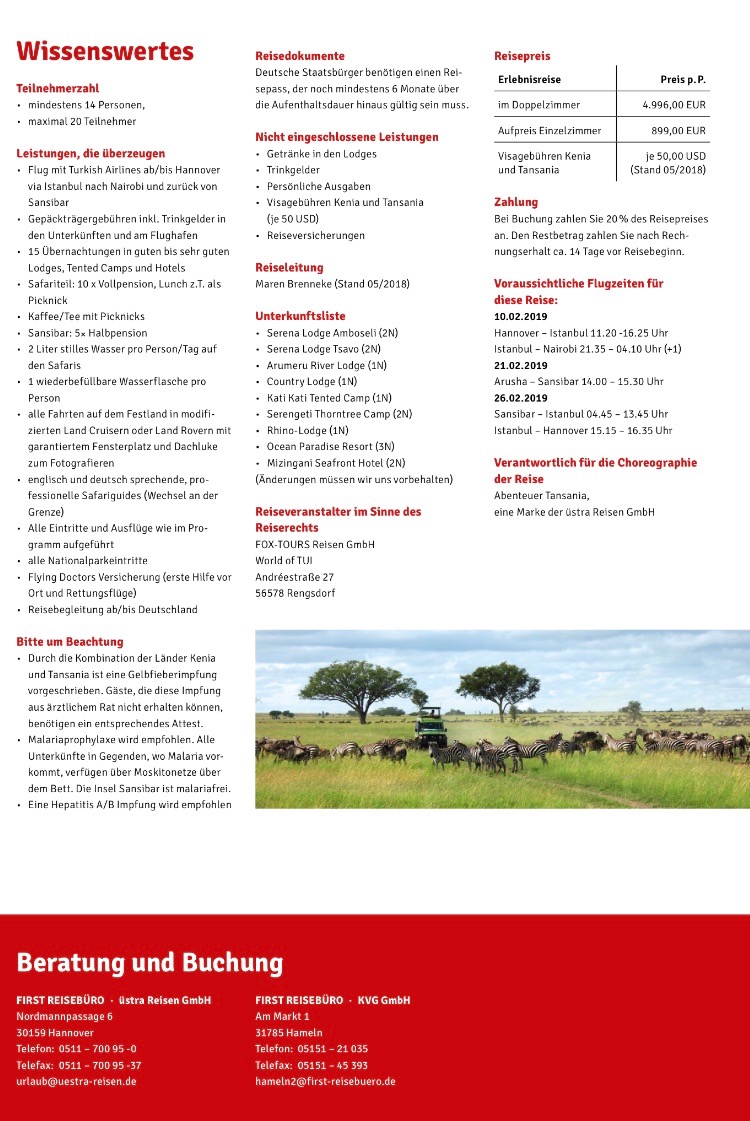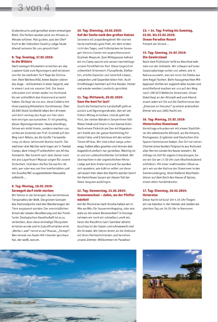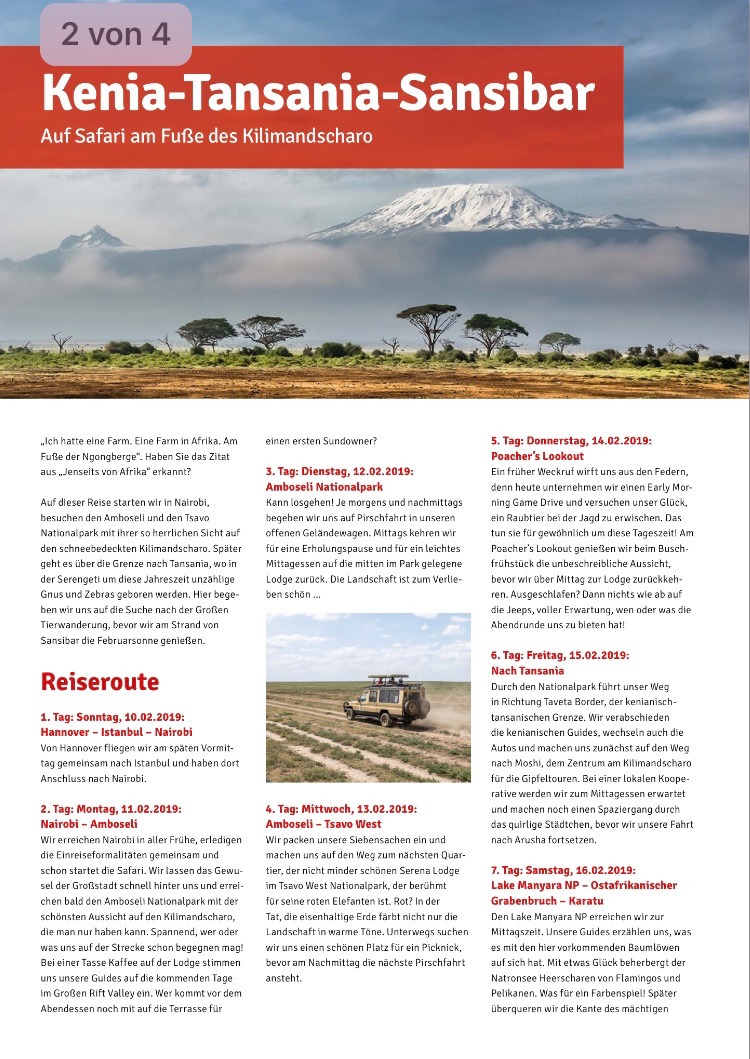 Es geht wieder in mein Wohnzimmer – und niemals werde ich müde, diese Reise anzutreten. Wir fliegen nach Nairobi und genießen aus den kenianischen Nationalparks Amboseli und Tsavo West den vielleicht schönsten Blick auf den Kilimandscharo, den man nur haben kann. Über Moshi geht es durch das Great Rift Valley, bis wir bei Mto Wa Mbu den Großen Graben überqueren und das Hochland von Ngorongoro und Serengeti ansteuern. Jetzt ist Geburtensaison und wir freuen uns auf zahllose Babyzebras in der südlichen Serengeti, zum anfassen nah. Die Reise endet auf der Koralleninsel Sansibar im Indischen Ozean. Traumhaft? Traumhaft.