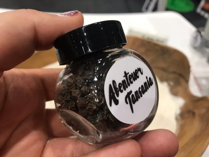 Wir haben Sand aus Sansibar zum Anfassen da, Pfeffer vom Markt in der Stonetown zum Mitnehmen (sind wir auf Sansibar schließlich dort, wo der Pfeffer wächst!) und, ganz nebenbei gesagt, wir haben auch ein Tässchen Kaffee und eine Sitzgelegenheit zum Ausruhen für eine gemütliche Pause im Messedschungel.